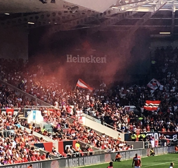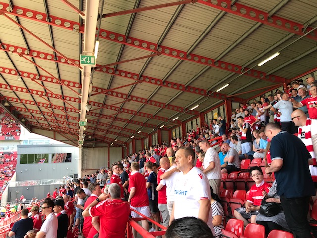 Overall it was a enjoyable day in an almost tropical Bristol. The M5 did its best to stop many of us getting there with the convoy of Silverdale coaches snaking over the bridge towards the ground after 2pm. Others more fortunate gathered and drank by the water outside the Novia Scotia and other drinking holes soaking up the sun and feeling rather glad that the football season was back.