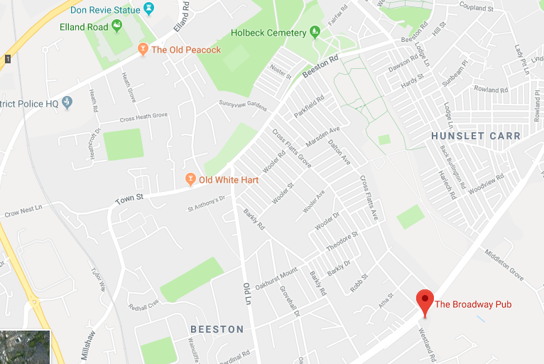 If heading up the M1 leave at Junction 41 and towards Morley / White Rose Centre via Dewsbury Road (A653). Around the Broadway pub there is lots of street parking – either Westland Road or across the main Dewsbury Road up on Cross Flats Grove. The stadium is approximately a 15 minute walk up to the top of Cross Flats Grove and then over the main road and down the grassy hill and you’ll see the stadium. Very simple. The benefit is you’ll avoid any parking costs and you will get out of Leeds an hell of a lot quicker after the game. The Broadway pub can also be used for a couple of drinks of you have time – it’s not spectacular but a half decent stop considering the lack of other options. The map below shows the Broadway (bottom) and Elland Road (top left) with the route to the ground.